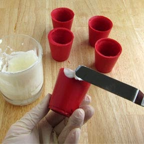 Utilizando una espátula o un cuchillo, raspamos a través del borde abierto del vaso para quitar el caramelo de goteo, esto es raspamos los bordes interiores para dejarlo lo más liso posible.