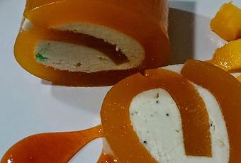 PREPARACIÓN:Para la gelatina.Pon en remojo las hojas de gelatina en agua fría.Tritura el mango y pasa por el chino (en thermomix, 1 m., V. progresiva), Vierte de nuevo en el vao.En un cazo cuece la carne del mango con el azúcar, y la miel, removiendo de vez en cuando para que no se pegue y se mezclen bien. (Con Thermomix hierve la pulpa del mango a temperatura varoma, velocidad 1. Cuando rompa a hervir añade el azúcar y miel, y deja a la mima velocidad y temperatura hasta que vuelva a hervir. Programa 2 m, a la misma velocidad y temperatura.)Escurre la gelatina y añádela. Remueve y vuelca sobre un molde rectangular de no más de 3 mm de alto.Deja enfriar (Con thermomix. Unos minutos ante de terminar, añade la gelatina escurrida.)