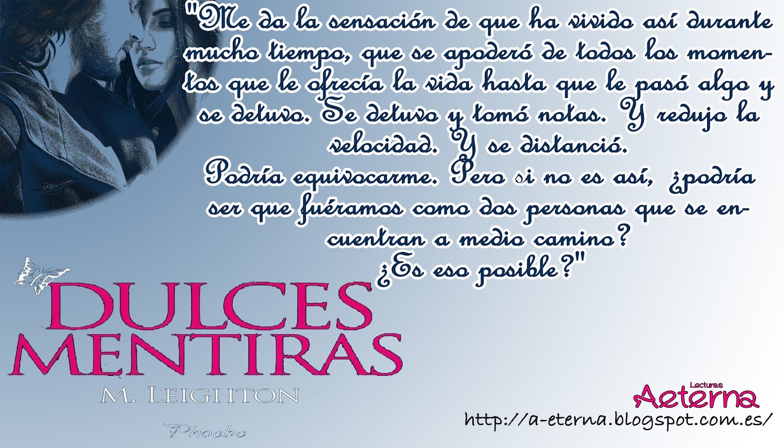 ¿Serán capaces de sobreponerse a esas dulces mentiras y vivir el presente, sabiendo que es todo lo que tienen?Opinión personalDulces mentiras es el primer libro de la nueva trilogía publicada en español de M. Leighton, la serie Pretty. En esta ocasión, la sinopsis es bastante fiel a lo que nos encontraremos en el libro:Dulces mentiras comienza en el momento en que Sloane cumple la mayoría de edad y va a hacerse un tatuaje que significará mucho para ella. Sobre todo el ansia de libertad que siente ante una familia de hombres policía que la sobre-protegen. En ese momento, conoce a Hemi; su tatuador. Y lo que empieza como una rebeldía acaba en una trama de misterios, engaños, venganza y... amor. He de decir que el libro me ha sorprendido para bien. Muy bien. En Dulces mentiras encontraréis una historia sencilla e interesante cargada de todo tipo de emociones. Sloane es nuestra protagonista femenina. Es una chica muy inocente (por eso de la sobre-protección que ha sufrido) y que quiere echar a volar, beber, conocer el amor... en definitiva; disfrutar la vida. Poco a poco irá configurando su carácter de adulta aunque a mí me sigue pareciendo demasiado sumisa."-No existe ningún nosotros. -Lo habrá dentro de treinta segundos si no te largas de aquí. -¿Y si no me quiero ir?"Hemi es... Hemi. (Jajajaja!). Nuestro protagonista masculino. Un chico de carácter fuerte y decidido que al contrario que Sloane... él ya ha vivido demasiado. Los secretos que guarda generarán el clima misterioso de la historia.