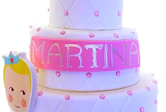 El nombre de Martina en grande en la tarta de enmedio que es la única que es de dulce de leche y las otras dos de chocolate.