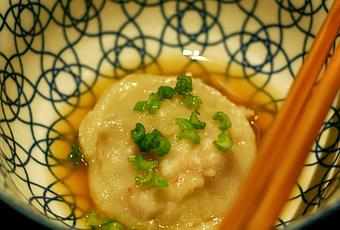 Mezclamos las harinas y una pizca de sal. Hacemos un hueco en el medio y añadimos el agua bien caliente. Mezclamos todo y dejamos reposar media hora. Para hacer el dumpling: Ponemos harina en la mesa de trabajo y extendemos una bolita de masa, tener cuidado porque la masa es muy húmeda y se os pegará. En el centro poner una cucharada de relleno y volver a formar la bolita, esta vez ya rellena. En una vaporera cocinar estas empanadillas durante 8 minutos. Emplatar: Ponemos en un cuenco un dumpling y regamos con el caldo reducido. Añadimos por encima cebollino picado para dar un punto de frescor.