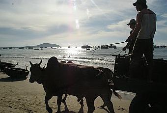 Fuimos a ver las dunas blancas, el lago de flores de loto, las dunas rojas y "el río por el que se camina hasta llegar a una cascada pequeñita". Todo muy bonito, aunque algo mal cuidado debido a las vacaciones vietnamitas y su turismo,local que gusta de arrojar basura allá por donde pasa. Lo mejor, sin duda, el pueblo pesquero al que me acerqué a las siete de la mañana para ver cómo sacaban el pescado del mar y cómo lo vendían, una maravilla. Además es característico por las barcas redondas que usan para transportarlo desde el barco grande a la costa.