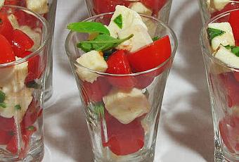 Lavamos bien los tomates y los partimos por la mitad (o en varios trozos si son muy grandes). Escurrimos la mozzarella y la cortamos en cuadraditos. Lavamos y secamos bien la albahaca y la picamos. Mezclamos todo en un bol sin aliñar y dejamos que la ensalada coja bien el sabor de la albahaca. Aliñamos en el momento de servir, para ello ponemos en un bol un buen chorro de aceite de oliva virgen extra de calidad, sal y pimienta negra recién molida, emulsionamos bien y regamos con este aliño la ensalada.Servimos en vasitos individuales o como más nos guste presentarlo, pero la verdad es que así queda monísimo, ¿no os parece?