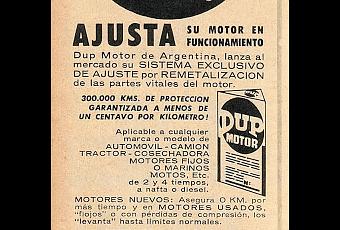 Lo cierto que la empresa Dup Motor Argentina SRL, con domicilio en la calle Florida 365, 1° piso, de la ciudad de Buenos Aires, anunciaba las bondades del nuevo sistema de ajuste por remetalización del motor. Se podía aplicar a cualquier vehículo con motor, de 2 y 4 tiempos, tanto de nafta como diésel.