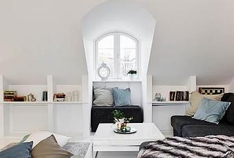 Se encuentra en la parte alta de la vivienda y por tanto es un espacio que está abuardillado. Esta zona tiene un amplio sofá con chaiselongue en negro y el resto de la estancia es de color blanco, paredes, techo e incluso el suelo.