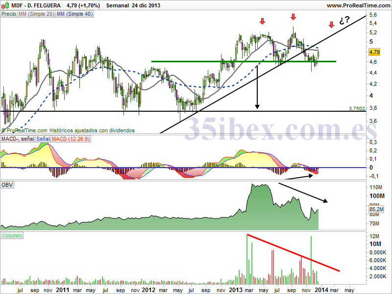 Sin embargo el OBV, nos dice lo mismo que en los gráficos semanales. El volumen se ha recuperado algo y dio entrada a finales de noviembre, lo que tenemos que ver es como se comporta cuando lleguemos a testear los máximos anteriores, suponiendo que lo consiga.Mi visión a corto plazo es de rebote, es muy probable que el precio se dirija a la primera resistencia, zona de 5 euros, que además coincide con la línea de tendencia alcista semanal. Ahí es donde tiene una verdadera prueba de fuego.Si rompe esa resistencia, la siguiente opción es que se vaya a buscar máximos anteriores, o sea zona 5.30.Me gusta el gráfico de Duro Felguera para intentar pillar un movimiento alcista, que incluso puede ser explosivo, pero si miro a los gráficos semanales o mensuales, mi opinión es que a medio plazo no me gusta y esperaría un movimiento que pueda llevar el precio a zonas de los 3.75. Pero esto ahora mismo es lo menos probable.http://feeds.feedburner.com/blogspot/dADkpn