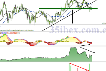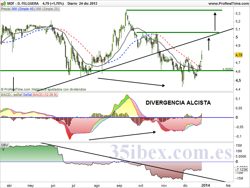 Como ya expuse en mi anterior análisis, la zona 4.50-4.60 era soporte y el MACD nos podía dar una divergencia alcista. Como se puede ver la divergencia existe, pero sólo en el histograma del MACD, no en sus líneas que están en el segundo punto ligeramente más bajas que en el primero.