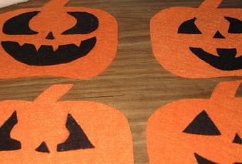 Mis calabacitas terminadas, están echas de fieltro... son superfáciles de hacer.Dibujas la forma de la calabaza en un folio, lo recortas y lo redibujas en fieltro naranja y lo cortas, ya tienes la calabaza, luego con fieltro negro cortas los ojos naricilla y boca y la pegas a la calabaza de fieltro, luego, pones una cinta y si quieres el rabito verde... y ya tienes la calabaza lista para colgar...
