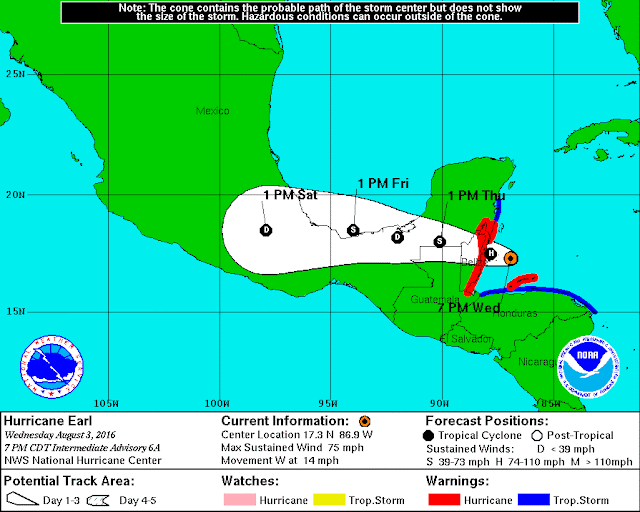 Lo más importante para destacar es que "Earl" seguirá aumentando su fuerza en las próximas horas, con un movimiento general del Oeste y una disminución en su velocidad de avance. Se espera que el sistema toque tierra en las costas de Belice entre la noche del día miércoles 3 de agosto y la madrugada del jueves 4, según ha informado El Centro Nacional de Huracanes con sede en Miami.Otra información importante para mencionar es que el sistema empezará a perder rápidamente intensidad, a medida que se mueva sobre tierra.