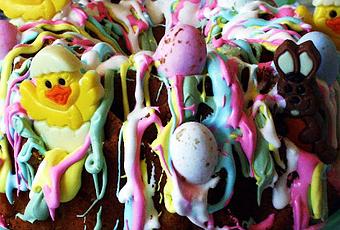 - Así que le dais color y rociáis sobre el bundt una vez frío y sólo os queda añadir las decoraciones de Pascua (en este caso) que más os gusten.