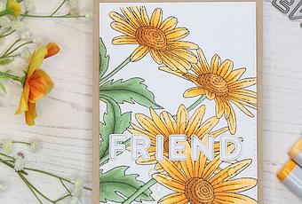 Para hacer esta tarjeta simplemente he estampado el sello de fondo "Drawn Daisies" sobre un trozo de cartulina Neenah Solar White, lo he coloreado usando rotuladores Copic y he troquelado el sentimiento "Friend Outline" sobre el panel. Después lo he troquelado de nuevo sobre cartulina blanca para crear un sentimiento "incrustado".