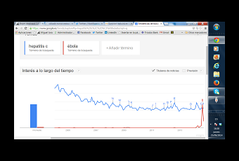 Ayer nos anunciaron que Sanidad incluirá en la financiación pública el medicamento Sovaldi para la hepatitis C. Todos los días estamos leyendo noticias relacionadas con el virus de ébola. ¿Cual creéis que es “más noticia”? O escrito de otra manera ¿qué relevancia tiene una u otra información?Puede parecer un juego aunque quizá no lo sea tanto. Mirad este gráfico de las tendencias de búsqueda de Google: