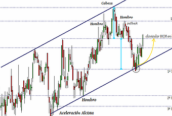 El rebote se ha producido en la parte baja del canal alcista trazado, combinada con la proyección de un objetivo bajista (
