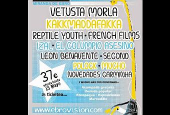 El festival Ebrovisión, que celebrará su decimocuarta edición del 4 al 6 de septiembre en Miranda de Ebro (Burgos), ha añadido este martes nuevos artistas a su cartel. Se trata de Vetusta Morla, Reptile Youth, El Columpio Asesino y Novedades Carminha. Estos fichajes se suman a Kakkmaddafakka, French Films, Izal, León Benavente, Second, Polock y Mucho. Toda la información en www.ebrovision.com.
