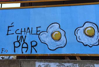 No es la primera vez que en esta valla publicitaria de la leonesa calle Reino de León se pueden observar mensajes tan variopintos como este. Desde luego, los huevos fritos pintados y coloreados con cierta maestría se me antojan bastante apetitosos al igual que lo será para el resto de peatones que paseen por la calle.Cada día está más claro, que en esta nuestra sociedad actual, no se puede vivir si no le echamos un par de huevos e incluso en ciertas ocasiones: cojones. Según están las cosas o más bien, según hemos dejado que estén las cosas o nos pongan las cosas o igual tenía que ser así, para vivir necesitamos echarle agallas y arresto a la vida. A casi todos nos permiten sobrevivir, pero vivir… Ufff.Échale un par para trabajar en lo que sea, a cambio de un salario cada día más indigno. Échale un par para llenar el depósito de gasolina al son de unos precios del crudo que no sabemos de dónde vienen aunque nos lo digan constantemente.Échale un par para gastarse 50 euros en la compra cuando no hace mucho 5000 pesetillas te daban para lo mismo y era una fortuna.Échale un par para ver la televisión, escuchar la radio o leer la prensa. Sin duda, una de las mejores opciones es sobrevivir en la ignorancia y quedarse con lo mejor de las emisiones: ¡los anuncios!Échale un par para comprobar como personas que se dedican a la cosa pública se convierten en personajes que se dedican a sus cosillas.Échale un par para “dar estudios” a un hijo o a dos, (pocos valientes se atreven a más) y pagar libros, material, ropa, academias, matrículas o máster normalitos a partir de 5 cifras de euros.Échale un par para pagar tantas cosas que hace tan solo una década ni existían y ahora se nos hacen imprescindibles.Échale un par para sonreír y sobre todo, échale muchos pares para reírse a carcajadas de los que parecen se ríen de nosotros porque nada mejor que reírse de uno mismo.Échale un par de huevos y en las ocasiones oportunas: ¡échale cojones, aunque no sean pares!GEOLOCALIZACIÓN