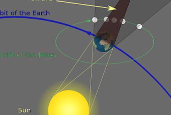 Como vemos en el gráfico, la sombra de nuestro planeta oscurecerá a la Luna. Fuente: WikipediaCabría pensar tras ver el gráfico anterior que se debería producir un eclipse de Luna cada vez que estuviéramos en Luna Llena, sin embargo, sabemos que no son fenómenos tan frecuentes. Lo que ocurre es que la órbita de nuestro satélite tiene una ligera inclinación de unos 5º respecto al plano de la eclíptica, esto es, el plano donde se encuentra la órbita de la Tierra alrededor del Sol. Los eclipses de Luna se producen sólo cuando la Luna está llena y ésta se encuentra en una de las intersecciones de su órbita con la de la Tierra. Estos puntos de denominan nodos (lo mismo pasa con los eclipses de Sol, la Luna Nueva ha de encontrarse en uno de los nodos).