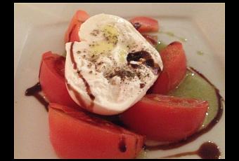 ensalada de queso burrata con tomate, aceite de tartufo y sésamo