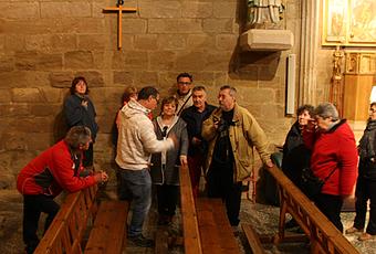 Reunidos en el interior de ese templo, Chis le explicaba que fue a raíz de unas obras de restauración en el templo de Santa María la Mayor de Abiego cuando al eliminar las pinturas que cubrían su interior, apareció cegada la típica entrada elevada de torre defensiva a más de tres metros del suelo actual. Empeñándose Chis, junto al entonces párroco, Juan Carlos Barón, que tras esa pared pudiera existir una escalera medieval, decidieron abrir un pequeño acceso para poder comprobarlo. Y, en efecto, siendo los primeros en franquearla tras cientos de años, descubre la entrada de la torre que permanecía tapiada por obra de ladrillo.