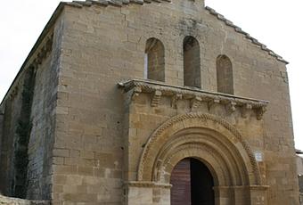 El exterior, de sillar trabajado. Vanos mínimos, estrecho y medio punto. Portada con tres arquivoltas, ajedrezado. En la clave un crismón de seis radios.