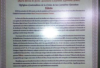 Arquidiócesis de Santiago de Guatemala.CausaDe Beatificación y Canonizaciónde la Sierva de Dios Madre María Teresa de la Santísima Trinidad ocd.(Maria Teresa de Jesús Anastasia Cayetana Aycinena Piñol)Religiosa Guatemalteca de la Orden de las Carmelitas DescalzasEdicto.