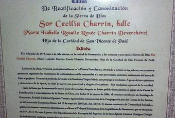 El 13 de julio de 1972, nace a la vida eterna, en la ciudad de Guatemala, a los 83 años la Sierva de Dios Sor Cecilia Charrín, Maríe Isabelle Rosalie Renée Charrín Deverchére Hija de la Caridad de San Vicente de Paúl.La Sierva de Dios, vivió con profunda confianza en la Divina Providencia, sirviendo a Cristo en los pobres, con respeto y paciencia, siguiendo las enseñanzas de los fundadores de la comunidad a la que perteneció; auténtico testimonio del amor de Dios al prójimo. Demostró profunda devoción a la Santísima Virgen María que propagó a los demás. A pesar de los vejámenes y situaciones de la época, no dejó de servir con prontitud y alegría a los pobres. Fe verdadero apóstol de la caridad. Ante la fama que ha aumentado con el pasar de los años, después de haber pedido formalmente el inicio de la Causa de Beatificación y Canonización de la Sierva de Dios, con fecha 15 de marzo de 2006, el entonces arzobispo de Santiago de Guatemala, Rodolfo Cardenal Quezada Toruño, siguiendo las orientaciones de la Congregación para las Causas de los Santos, en la Instrucción Sanctorum Mater, del 27 de mayo de 2007 (cfr.Art.43§§1.3), damos a conocer a la Comunidad Eclesial, a quienes invitamos a comunicar directamente o llevar al Tribunal Eclesiástico de la Arquidiócesis de Guatemala, que se encuentra en la 7a. Av. 6-73, zona 1, junto a las dependencias de la Parroquia del Sagrario, de la Santa Iglesia Catedral (Antiguo Colegio de los Infantes), cualquier noticia de la que tengan conocimiento, sea a favor como en contra de la fama de santidad de la Sierva de Dios. Como se tiene que recoger todos los escritos atribuídos a la Sierva de Dios, ordenados, con el presente Edicto, a cuanto los tuvieran en posesión, entregarlos con la debida diligencia al mismo Tribuna arriba descrito; en especial los que tengan como autora a la Sierva de Dios y nos que aún no han sido entregados a la Postulación de la Causa.
