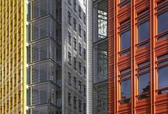 Cada fachada es única, a diferencia de su altura, orientación, color y su relación con la luz natural. Los elementos primarios son el vidrio, acero y cerámica. En cada una la cerámica se utiliza con distintas sombras y colores que responden a los edificios linderos, lo que ayuda a integrar el sistema en el entorno urbano inmediato.