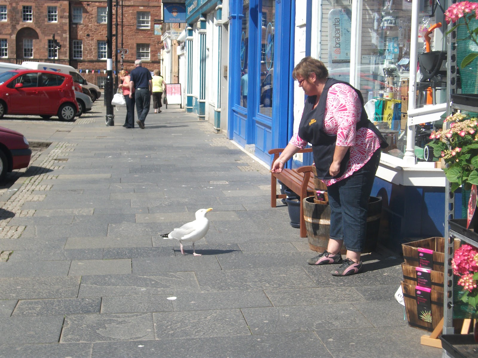 Un día, desde Edimburgo, desde la estación central, cogimos un tren en la mañana y en 30-40 minutos, no recuerdo, estábamos en este pueblo....., a medida que nos adentrábamos en el, se percibían mas los olores del mar, el sabor marinero, la escocia pueblerina, autentica, que te recuerdan a tantas películas que hemos visto de pequeños, sobre marineros que se embarcan hacia el nuevo mundo (pues si que inspira la musiquita...jejejejeje)......Al fondo de esta calle, donde veis a esta tendera dar de comer a una gaviota,........