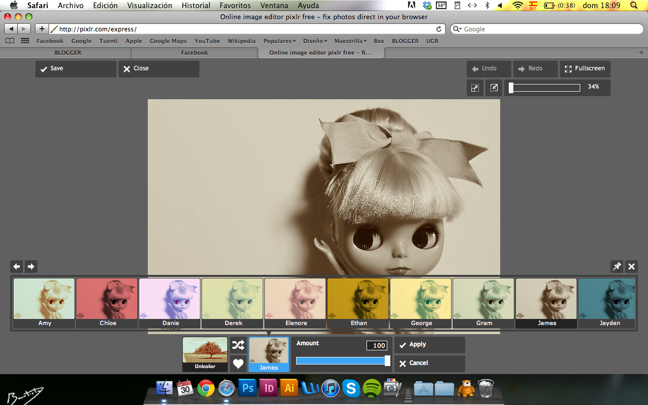 Además, dentro de cada opción, hay muchas más posibilidades. En este caso hemos elegido la opción Unicolor, y dentro de esta, la opción James. Como veis, nuestra imagen pasa de estar a color, a tener este tono entre sepia y beige, ¿bonita verdad? seguimos pues...