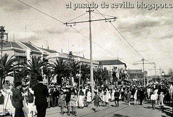 Que bonita, estas fotografías nos dan tantos detalles, tantos testigos mudos que sin saberlo iban a ser protagonistas un siglo después. Estamos al final de Eduardo Dato, apunto de tomar la subida del Puente de San Bernardo, observen el largo del antifaz de los nazarenos, o esas viejas catenarias que tan habituales eran en el paisaje de nuestras calles y esos hermosas farolas que flanqueaban la entrada a la subida del puente, por cierto, ¿y las farolas?...