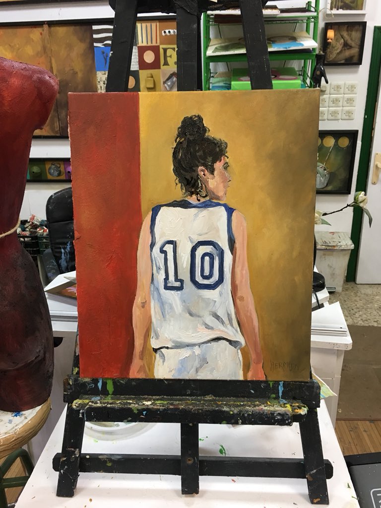 —¿Has acabado todos los retratos del Uni?No, me falta el de Marina [Delgado], y Lino [López] me pidió que, por favor, le hiciese uno a Sandra [Prieto, la entrenadora ayudante] y a Álex [de la Vega, el preparador físico]. ¿Y cómo podría negarme? Soy incapaz de dejar huérfana a la familia. A Ana [Suárez] ya le di su cuadro.