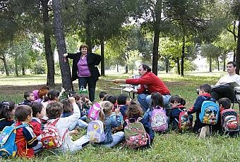 Hoy era el día. Alumnos de primaria del colegio Ángel Ganivet de Sevilla tenían una cita con las Aves en el pequeño parque que está cruzando la calle: el Parque Infanta Elena.