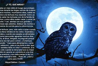 Contaba un viejo roble al musgo que protegía sus raíces durante las largas noches de invierno que hacía muchos, muchísimos años, habitó en su tronco una lechuza muy especial. Como ya debéis saber las lechuzas son de la familia de los búhos y como ellos suelen cazar y comer de noche. Y así, atentas con sus grandes y poderosos ojos abiertos, dedican las noches a proveerse de comida para la sobrevivencia. Aquella lechuza, pero, sólo salía a cazar cuando la luna llena reinaba en los cielos. Esperaba y esperaba y cuando eso pasaba se alimentaba tanto como para poder aguantar muchos días… Un día, el árbol, intrigado, le preguntó porqué hacía eso tan poco común, y la lechuza respondió: “ Cazo para alimentarme y como para sobrevivir, ¿pero si me limito a eso, que otros sentidos tiene mi vida? Y entonces, si lo hago sólo cuando la reina luna luce su mejor vestido mi cacería se convierte en una muy bella aventura y con cada manjar le doy un sentido especial a todo… Pues así, ¡cazo y como para VIVIR!