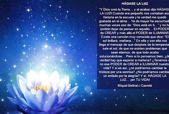 “Y Dios creó la Tierra… y al acabar dijo HÁGASE LA LUZ! Cuando era pequeño nos contaban esa historia en la escuela y la verdad me quedó grabada en el alma… Ya de mayor he escuchado muchas veces eso de: “Dios está en ti…” y no he podido dejar de pensar en aquello… El PODER de CREAR y más allá el PODER de ILUMINAR. Existe una canción muy conocida que dice: “El sol brillará, mañana…” En ella y con ella nos llega el mensaje de que después de la tempestad sale el sol, de que no existen problemas que sean eternos, de que todo acaba solucionándose… Pero si lo pensamos bien, ¿de verdad hay que esperar a mañana? ¿Tenemos o no ese PODER de CREAR e ILUMINAR nuestra vida? Y si es así, ¿no podríamos cambiar la tristeza por una sonrisa? ¿No podríamos cambiar un enfado por la alegría? Y sí, HÁGASE LA LUZ… ¡en TU VIDA!