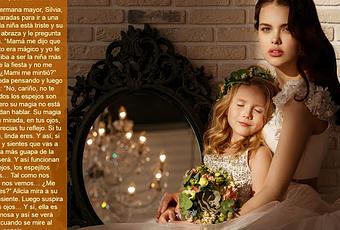 Alicia y su hermana mayor, Silvia, están preparadas para ir a una fiesta. Pero la niña está triste y su hermana la abraza y le pregunta que le pasa. “Mamá me dijo que este espejito era mágico y yo le pregunté si iba a ser la niña más guapa de la fiesta y no me contestó. ¿Mami me mintió?” Silvia se queda pensando y luego responde: “No, cariño, no te mintió. Todos los espejos son mágicos, pero su magia no está en que puedan hablar. Su magia reside en tu mirada, en tus ojos, en como aprecias tu reflejo. Si tu te ves linda, linda eres. Y así, si tu te miras y sientes que vas a ser la niña más guapa de la fiesta, así será. Y así funcionan los espejos, los espejitos mágicos… Tal como nos sentimos, nos vemos… ¿Me comprendes?” Alicia mira a su hermana y asiente. Luego suspira y cierra los ojos… Y sí, ella es muy hermosa y así se verá siempre cuando se mire al espejo.
