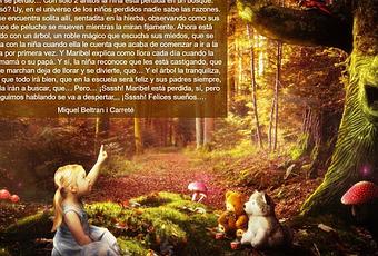 Maribel se perdió… Con sólo 2 añitos la niña está perdida en un bosque. ¿Qué pasó? Uy, en el universo de los niños perdidos nadie sabe las razones. Maribel se encuentra solita allí, sentadita en la hierba, observando como sus muñecos de peluche se mueven mientras la miran fijamente. Ahora está hablando con un árbol, un roble mágico que escucha sus miedos, que se preocupa con la niña cuando ella le cuenta que acaba de comenzar a ir a la escuela por primera vez. Y Maribel explica como llora cada día cuando la dejan su mamá o su papá. Y sí, la niña reconoce que les está castigando, que cuando se marchan deja de llorar y se divierte, que… Y el árbol la tranquiliza, le cuenta que todo irá bien, que en la escuela será feliz y sus padres siempre, siempre la irán a buscar, que… Pero… ¡Ssssh! Maribel está perdida, sí, pero si seguimos hablando se va a despertar,,, ¡Ssssh! Felices sueños….