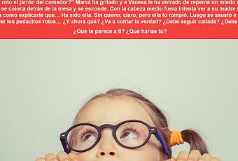 "¿Quién ha roto el jarrón del comedor?" Mamá ha gritado y a Vanesa le ha entrado de repente un miedo muy fuerte. La niña se detrás de la mesa y se esconde. Con la cabeza medio fuera intenta ver a su madre mientras piensa como explicar que...; ¡Ha sido ella! Sin querer, claro, pero ella lo rompió. Luego se asustó e intentó esconder los pedacitos rotos... ¿Y ahora qué? ¿Va a contar la verdad? ¿Debe seguir callada? ¿Debe mentir?