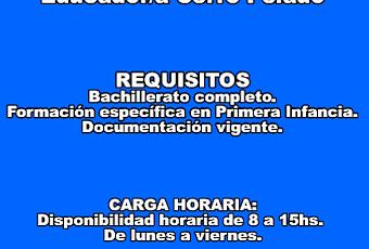 Lea con Atención !!Al Final de la Publicación Está el Acceso al Registro...Brindamos la Información Como nos Gusta Recibirla...Inscripciones hasta el 30/01/2026DETALLES DEL ANUNCIO DE EMPLEO👀Requisitos:Bachillerato completo.Formación específica en Primera Infancia.Documentación vigente.Disponibilidad horaria de 8 a 15hs. De lunes a viernes.Se valorará:Experiencia previa, comprobable en CAIF.Curso de formación básica de educadores en primera infancia, otorgada por el Centro de Formación y Estudios de INAU (CENFORES).Interés en formar parte de la cooperativa.Capacidad de trabajo en equipo.Apertura a seguir formándose en relación al cargo.Carga horaria: 35 horas semanales.
