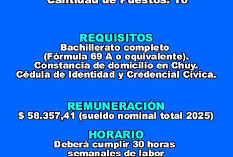💼 Remuneración:$ 58.357,41 (sueldo nominal total 2025)Deberá cumplir 30 (treinta) horas semanales de labor,de acuerdo al régimen de turnos y descansos planificados por cada Dirección.