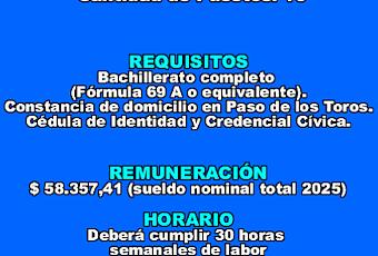 📋 Requisitos Excluyentes:Bachillerato completo (Fórmula 69 A o equivalente).Constancia de domicilio en Paso de los Toros.Cédula de Identidad y Credencial Cívica.