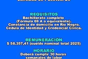 💼 Remuneración:$ 58.357,41 (sueldo nominal total 2025)Deberá cumplir 30 (treinta) horas semanales de labor,de acuerdo al régimen de turnos y descansos planificados por cada Dirección.