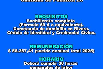 📋 Requisitos Excluyentes:Bachillerato completo (Fórmula 69 A o equivalente).Constancia de domicilio en Rivera.Cédula de Identidad y Credencial Cívica.