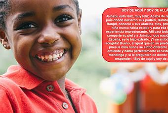 Jainabu está feliz, muy feliz. Acaba de regresar del país donde nacieron sus padres, Gambia, y allí, en Banjul, conoció a sus abuelos, tíos, primos, … La niña nunca había estado y para ella fue una experiencia impresionante. Allí casi todo el mundo comparte su piel y a Jainabu, que nació y vive en España, se le hizo extraño. ¡Y se sintió tan bien acogida! Bueno, al igual que en su pueblo español, pues la niña nunca se sintió diferente. Jainabu entiende y habla perfectamente el castellano y el mandinga y, si le preguntan de donde es, suele responder: “Soy de aquí y soy de allá”.
