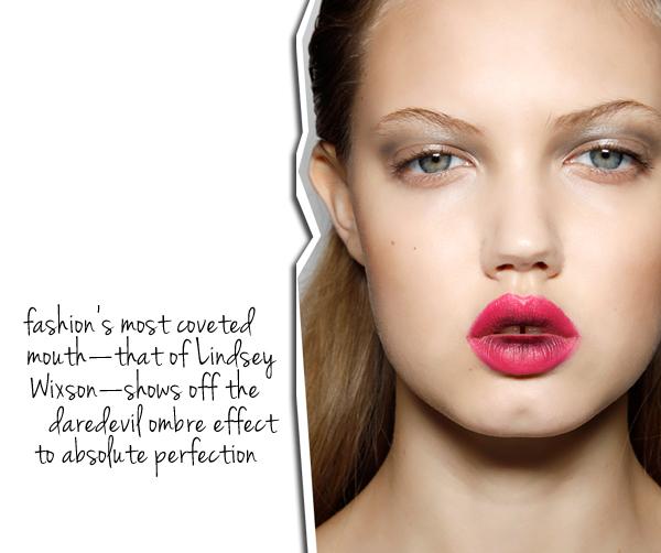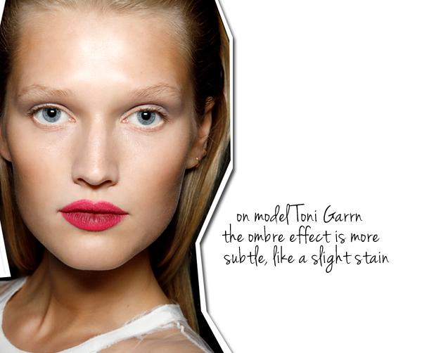 get the look: 1. Yves Saint Laurent 'Rouge Volupte Pearl' in Lingerie Pink 2. Nars in Schiap 3. MAC Chenman Gloss Seguro que cuando oyes hablar sobre el efecto ombré lo relacionas rápidamente con el cabello. Efectivamente, ha sido multitud de celebrities las que durante la pasada temporada se unieron a esta tendencia. Una técnica que consiste en darle un efecto degradé a la melena. Incluso muchas se atrevían con originales combinaciones de color tiñendo las puntas de rosa fucsia o azul pastel como hacía Kate Bosworth. Ahora esta tendencia vuelve a reinventarse esta vez en los labios. Una tendencia llamativa y arriesgada