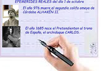Llegamos al 1 de octubre y en esta fecha hemos de conmemorar dos Efemérides Reales. La primera es del año 976, en cuyo año fallece en la ciudad de Córdoba el que durante 15 años fue su califa, Al Hakam II. Mientras que el año 1685 nacía en Viena el que con el paso de los años se convertiría en el pretendiente austriaco al trono español en disputa con el pretendiente francés Felipe de Anjou, nos referimos a Carlos Francisco de Habsburgo y Neoburgo