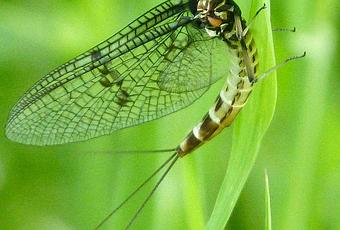 Como su nombre indica, la efímera no tiene una larga vida. Es un insecto muy particular, cuyas numerosas especies constituyen uno de los órdenes más notables. Los adultos poseen dos alas anteriores bien desarrolladas. Por el contrario, el par de alas posteriores es pequeño o incluso puede llegar a faltar. El cuerpo, alargado, termina en largas sedas o filamentos llamados cercos. La biología de las efímeras es digna de interés, ya que estos frágiles insectos consagran prácticamente toda su breve existencia a la reproducción. Una vez nacido el insecto, no se alimenta, ya que no tiene boca funcional. Con este dato, se concibe que su vida no pueda durar mucho. Las efímeras nacen casi siempre al mismo tiempo y los machos se juntan en enjambres para revolotear en el aire como si de nubes se tratara. Estas concentraciones de machos atraen a las hembras, siendo, cada una de ellas, fecundada por un «bailarín». La pareja se aleja del enjambre para aparearse. El macho muere casi inmediatamente después de la copulación. La hembra vive justo el tiempo necesario para poner los huevos. Sobrevuela el agua y va dejando caer los huevos sin posarse.