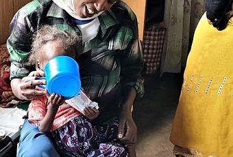 Gracias al seguimiento cercanos, al cuidado intensivo en estos primeros días, ahora, más de dos semanas después del ingreso, Efrata puede ya sostenerse en pie y tomar por si sola la leche terapéutica.