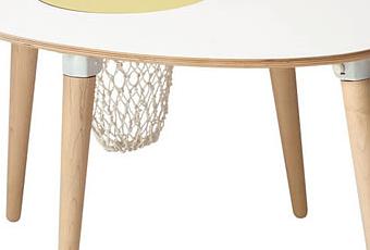 Lo llamativo de la mesa es que en un sector cuenta con un calado con tapa y una red que cuelga por debajo, pensada para colocar allí los juguetes o los elementos de arte de los niños, para que tengan todo a mano a la hora de jugar.