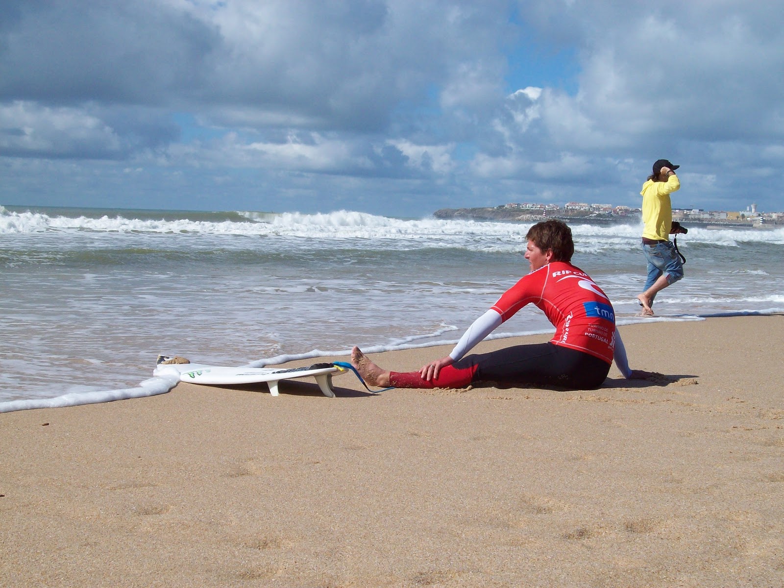 Acto seguido, se puso la licra roja, cogió su tabla y se dirigió a la orilla a estirar antes de su manga. Y ahi vienen las fotos de las que os hablaba. Se sentó en la orilla y se puso a estirar y a mirar el mar, abstraído de las decenas de cámaras que le apuntaban.