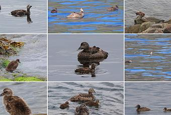 Durante mi viaje a Islandia en julio, observé numerosos eiders comunes (Somateria mollissima) en las costas, habitualmente acompañados de sus crías. A diferencia de mi experiencia previa en el puerto de Vilanova i la Geltrú (27.IX.2024), donde vi un único ejemplar, en Islandia era frecuente encontrarlos en grupos familiares nadando cerca de zonas rocosas y con algas. Julio coincide con su temporada de cría, por lo que las hembras se desplazaban junto a los polluelos, aprovechando aguas poco profundas y tranquilas que ofrecen alimento abundante, principalmente moluscos y crustáceos.Desde un punto de vista ornitológico, este periodo permite observar distintas fases del desarrollo de las crías. En las imágenes, se aprecia cómo algunos polluelos nadan muy próximos a la madre, mientras otros se aventuran a explorar zonas rocosas cercanas. Esta variabilidad sugiere diferencias en edad o desarrollo dentro de una misma nidada. En Islandia, la estructura del hábitat costero, con abundancia de refugios y recursos, facilita documentar su comportamiento, desde la natación temprana hasta la alimentación independiente.