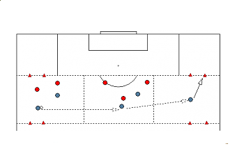 Realización: Juego 4X4 + 4 comodines+ 2 porteros: 8  atacantes situados los 2 medias puntas + 1 delantero centro +1 pivote  en el interior del espacio de juego, los 4 extremos en las bandas (comodines)   tratan de finalizar en la portería neutral  contra un equipo de 4 defensores que tratan de recuperar el balón y evitar el gol. El tamaño del campo será de 20x16m. Si las defensas recuperan el balón pasan  a defender el equipo atacante. Si tras finalización se consigue gol el equipo atacante sigue con la posesión del balón. Si tras finalización sin gol se cambia la posesión del balón. Pautas ataque: máximo 2 toques, pases cortos a ras de suelo. Pautas defensa: bascular  en función de la posición del balón, escalonarse uno presiona al poseedor los otros 3  cobertura, evitar los pases interiores y el tiro.  Sin título